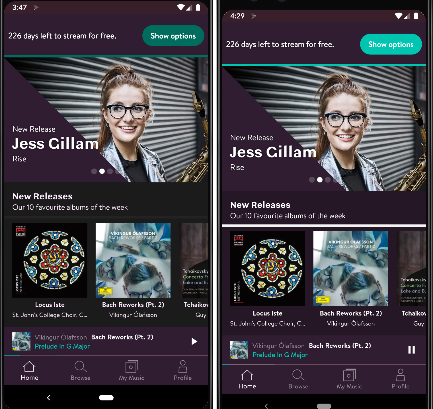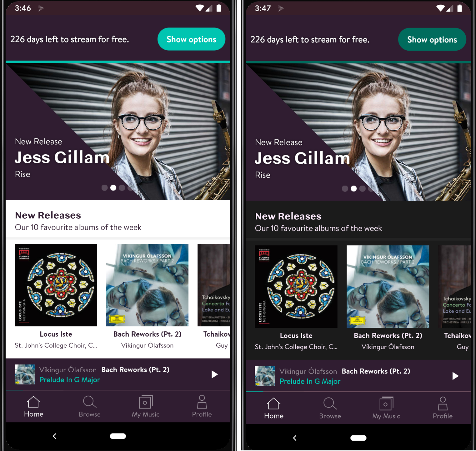 This allows the OS to force Dark Theme on your app when rendering (only on Android Q). It actually does this quite well by dimming bright colors and keeping dark backgrounds intact. We’ve tried it on the Primephonic Classical Music app that we build and the result looks like this: