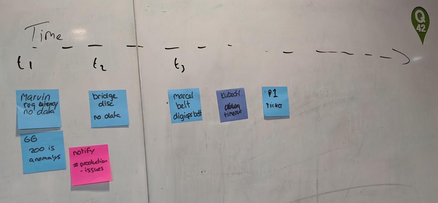 Dungeon master: “To get inspiration on the scenarios that we could throw at the team, we looked through our post mortem write-ups and selected three interesting ones. The scenarios had manifested themselves, when none of the new team members were on board yet, so they didn’t know (a lot) about these encounters. We had the metric data of those events in Datadog (our monitoring dashboard), so we could show these to the team if they asked to see them.”